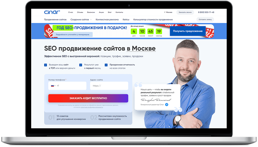 Раскрутка сайтов включает в себя работу специалистов нескольких направлений. Привлекаются маркетологи, дизайнеры, копирайтеры. Прорабатывается каждая составляющая часть сайта клиента для того, чтобы повысить его позицию в поисковых системах. Именно грамотный подход к раскрутке портала способен привести компанию к успеху в той или иной отрасли. Благодаря постоянному росту клиентов в агентстве “CINAR”, мы продвигаем сайты недорого.